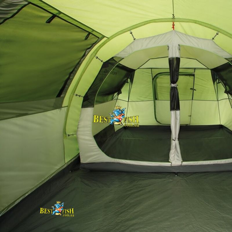 Дополнительный комфорт предоставляет перегородка, разделяющая внутреннюю палатку на два помещения. Учитывая двухслойную конструкцию, двухточечную систему штормовых оттяжек и наличие пола по всему периметру палатки, степень водозащиты вполне достаточна, чтоб, при правильной установке, сохранить палатку внутри сухой во время дождя. Чехол палатки закрывается на молнию, что очень удобно при упаковке палатки.