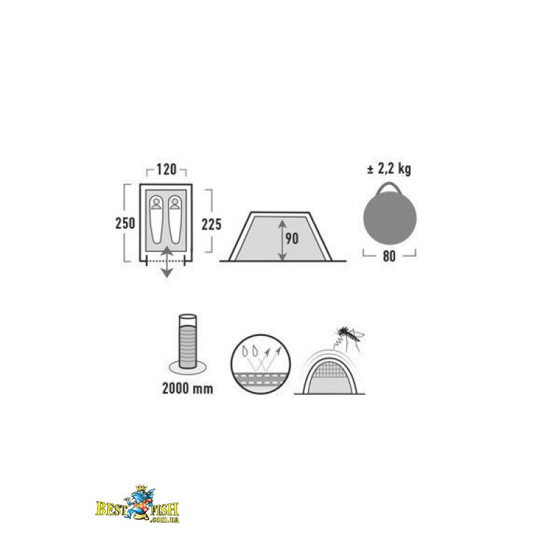 - Габарити внутрішнього намету (ДхШхВ), мм: 2250x1200x900