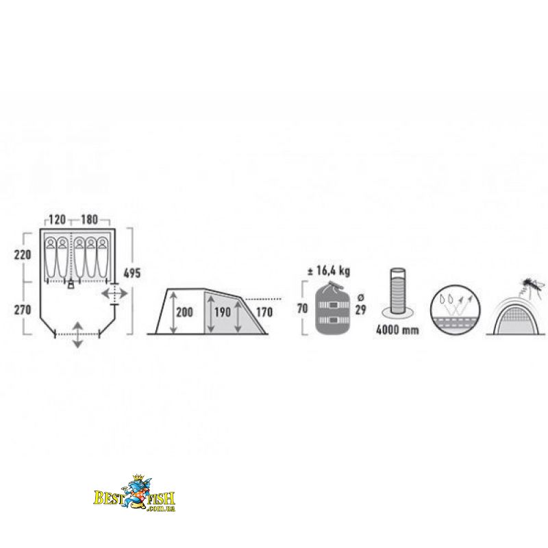 - Габариты внешней палатки (ДхШхВ), мм: 4950x3000x2000