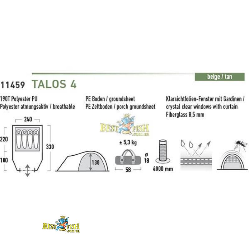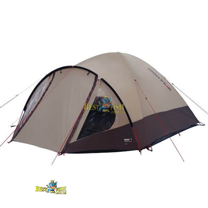 Палатка High Peak Talos 4. Туристическая двухслойная, 4-х местная палатка для непродолжительных походов. Удобный тамбур для хранения снаряжения. Вход с защитной антимоскитной сеткой, вентиляционный клапан, простая установка.
