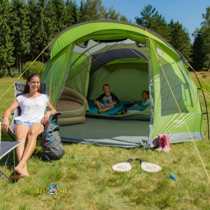Большой тамбур создает дополнительное пространство палатки и навес от солнца или дождя, позволяя разместить багаж, организовать кемпинговую кухню или место для отдыха.
