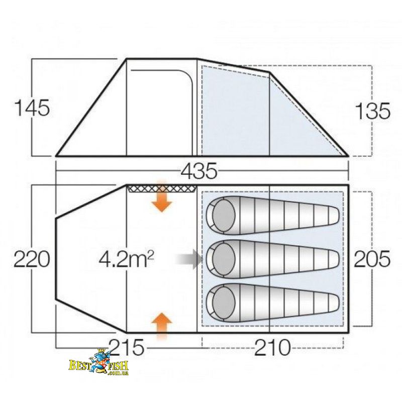 - Внешняя палатка (ДхШхВ), мм: 4350 х 2200 х 1450