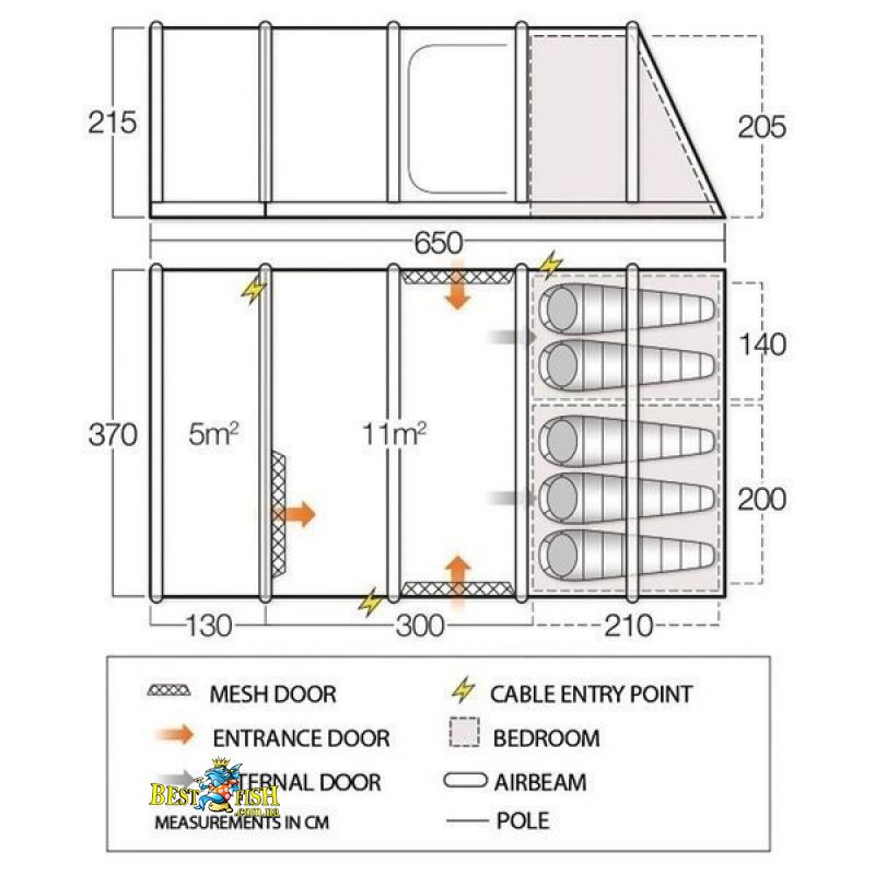- Внешняя палатка (ДхШхВ), мм: 6500 х 3700 х 2150