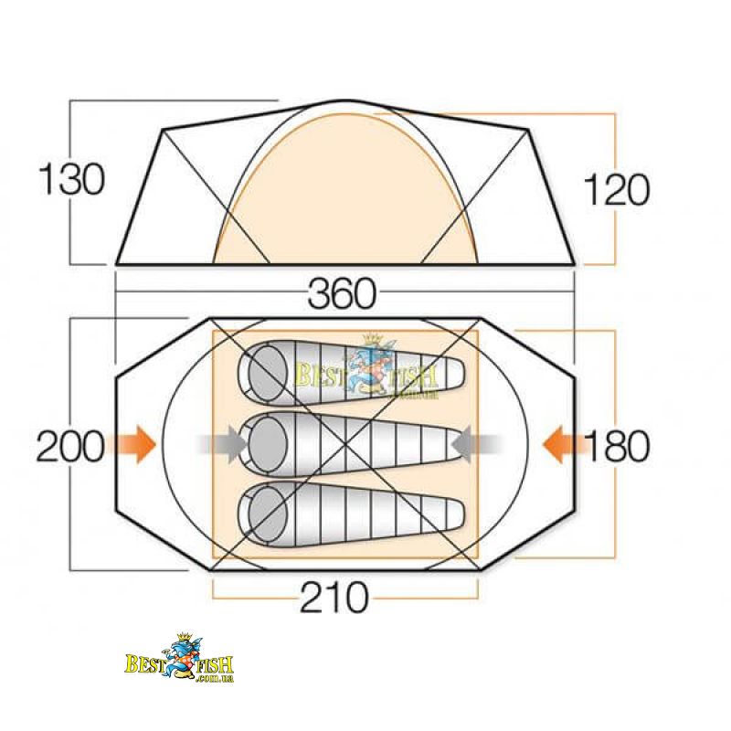 - Внешняя палатка (ДхШхВ), мм: 3600 х 2000 х 1300