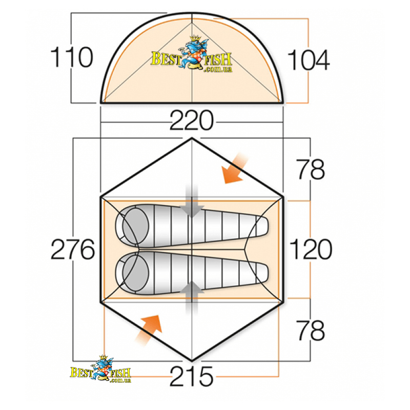 - Для облегчения, быстрой и правильной установки внутренней палатки, по отношению к внешней, применена цветовая маркировка фастексов и опорных дуг.