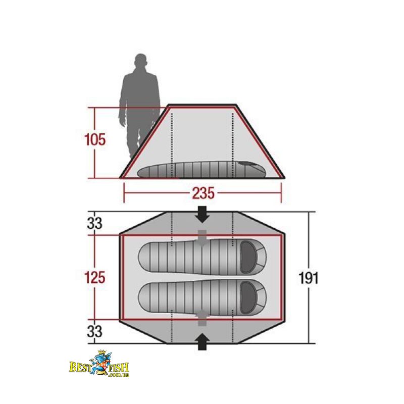 - Внутренняя палатка (ДхШхВ), мм: 2350 х 1250 х 1050