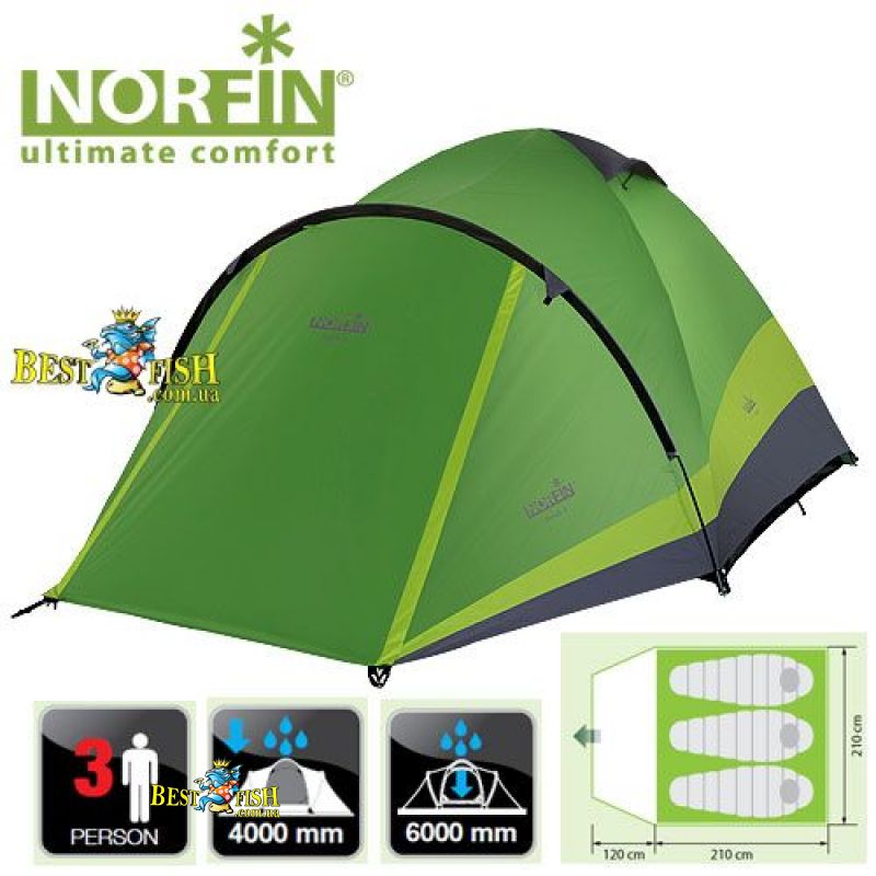 Намет 3-х місцева Norfin PERCH 3 NF. Універсальна двошаровий намет з просторим тамбуром. Класична стійка конструкція. Наявність третьої дуги над входом утворює дах, яка перешкоджає попаданню дощу всередину навіть при відкритих дверях тамбура.