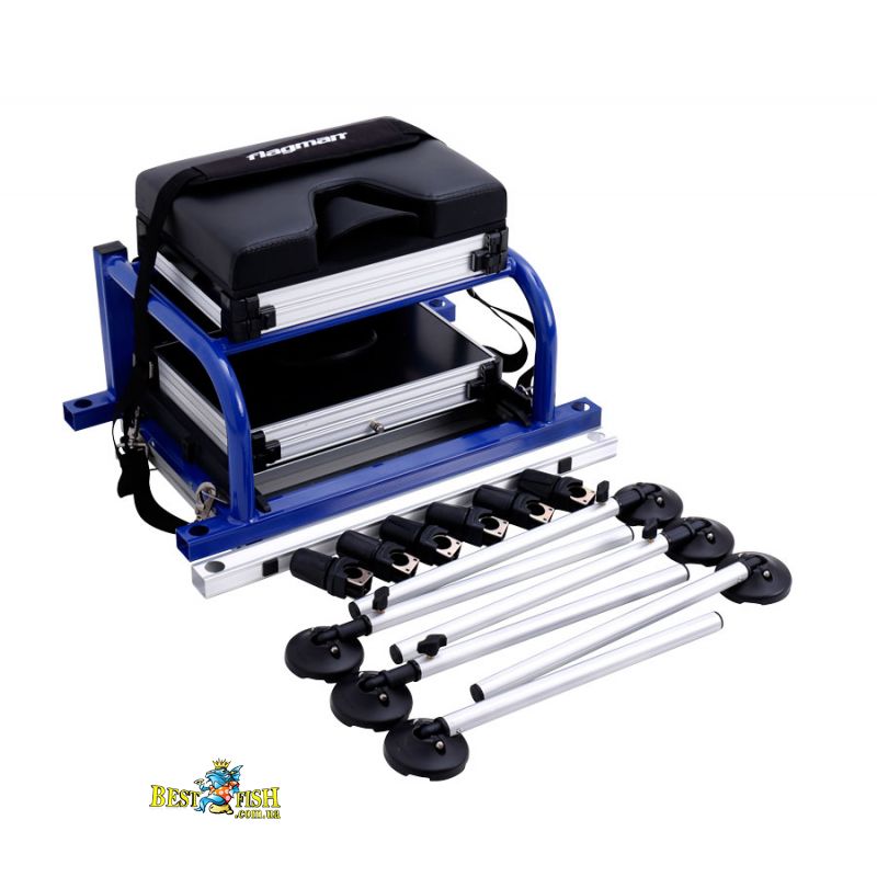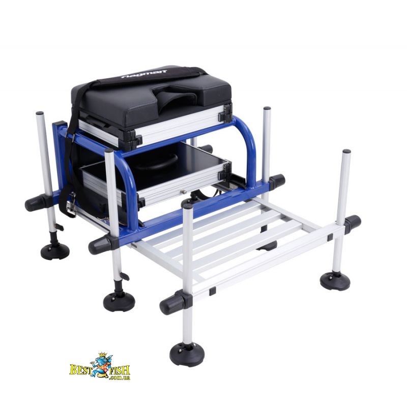 Міцна, стійка платформа, яка задовольняє вимогам як любителів, так і професіоналів. Її основу складає потужна зварна рама з алюмінієвих труб. До неї кріпляться основний модуль з ящиком, сидінням і висувним ящиком (висувається в бік), а також додатковий знімний висувною модуль, який може бути доповнений модулями, що придбані окремо. Спеціальний фіксатор не дає цього модулю мимовільно висуватися. Основний модуль також може доукомплектувати додатковими модулями. У конструкції модулів використані спеціальні засувки-шарніри, які дають можливість відкривати кришку модуля з двох сторін. Зручне, м'яке сидіння оснащене держателем для комля штекерного вудилища. Платформа обладнана алюмінієвої, висувний Педаном. У комплект входять 6 ніг: 4 - на платформу, 2 - на Педана. 4 з 6 ніг мають телескопічну конструкцію. Широкі п'яти не дають платформі провалюватися в грунт. Вони зроблені таким чином, що можуть нахилятися в будь-яку сторону, завдяки чому легко встановлюються на нерівному рельєфі. Для перенесення платформи передбачений швидкознімний ремінь з чотирма точками кріплення. Ноги мають діаметр 25 мм, на них можна встановлювати навісне обладнання Flagman, яке має оригінальні швидкоз'ємні кріплення - вони дозволяють встановлювати обладнання збоку, що особливо важливо при використанні декількох одиниць на одній нозі. Кожну з них можна знімати і приєднувати окремо, не чіпаючи інші. Також можна встановлювати будь-яке обладнання, розраховане на даний діаметр ніг.
