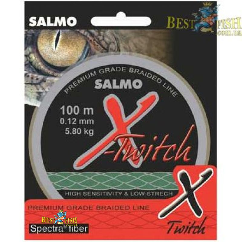 Плетеный шнур SALMO X-TWITCH 100 m. Плетёная леска SALMO X-TWITCH разработана специально для спиннинговой ловли. Она изготовлена из прочного волокна SPECTRA (USA), имеет круглое сечение и “скользкую” поверхность, что обеспечивает максимальную дальность заброса приманки. Благодаря практически нулевой растяжимости, даже малейшая поклевка не останется незамеченной. Плетёная леска SALMO X-TWITCH отличается повышенной износостойкостью и долговечностью. Расцветка тёмно-зелёная. Рекомендуем использовать этот шнур в комплекте с безынерционной катушкой SALMO ELITE X-TWITCH и спиннингом SALMO ELITE X-TWITCH.