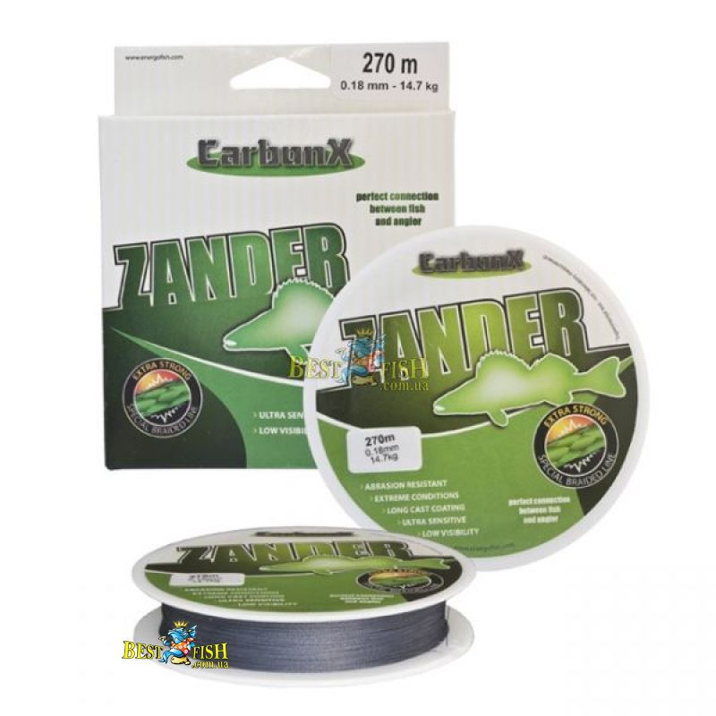 Плетений шнур Сarbon X ZANDER 0,10mm (270M) 8,4кг сірий, зносостійкий, має високу міцність і не розтягується, легко виводити велику рибу в різних умовах лову.