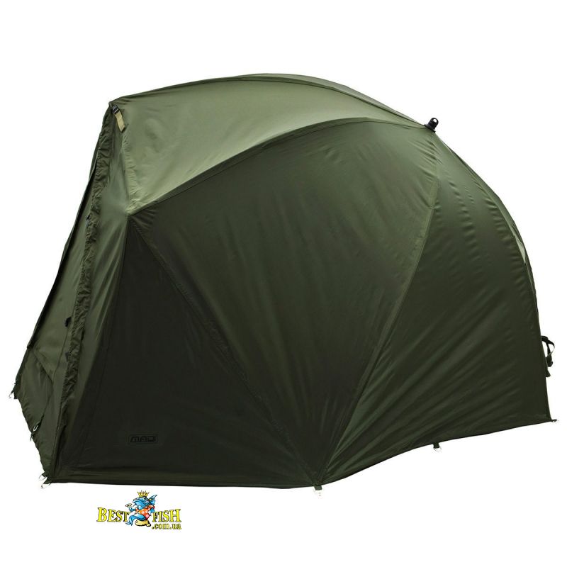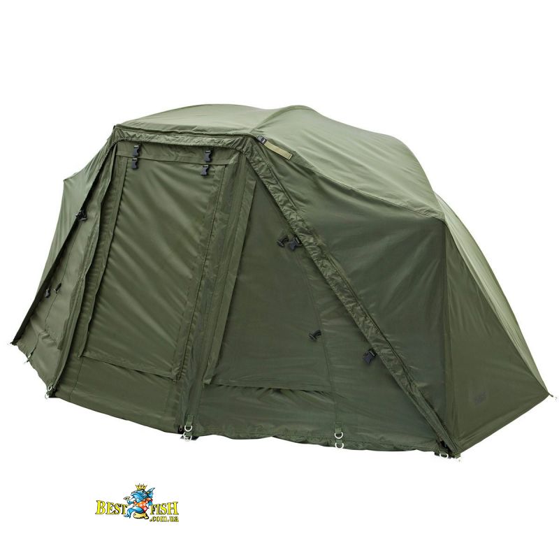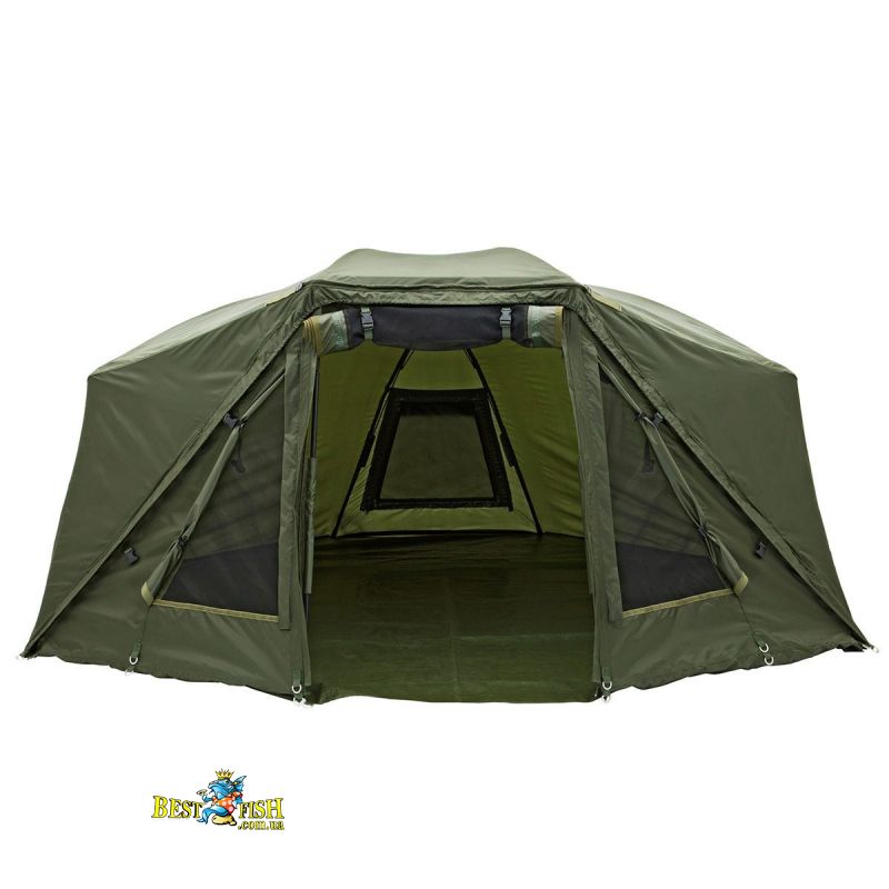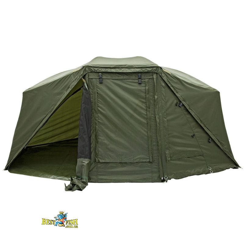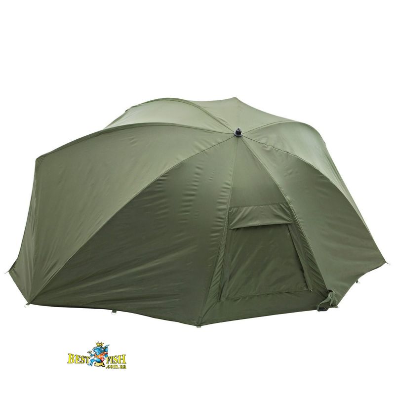 Напівавтоматична коропова намет, з механізмом у вигляді парасольки. Передня частина намету може бути повністю відстебнути для кращого огляду на ваші снасті. Надзвичайно міцний нейлоновий матеріал зберігає вашу палатку сухою. Каркас у вигляді парасольки забезпечує більше внутрішнього простору, дозволяючи вам розмістити розкладачку ближче до задньої стінки. Для вентиляції в теплу погоду на задній стінці намету є велике вікно. Поставляється у великій сумці для перенесення. У комплекті підлога і кілочки.