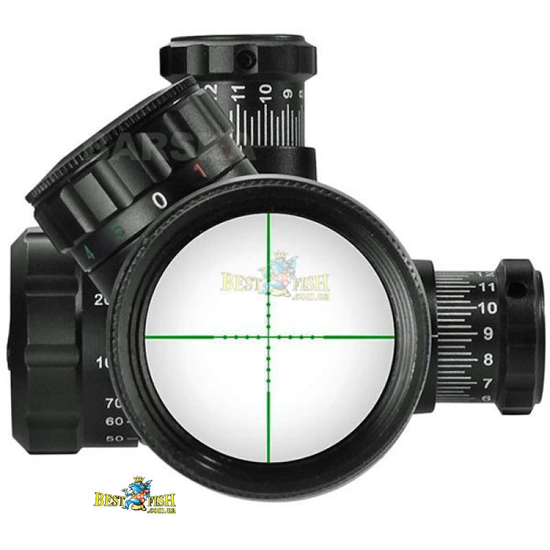 - Подсветка прицельной сетки: красная/зеленая, регулируемая, по 5 уровней яркости для каждого цвета