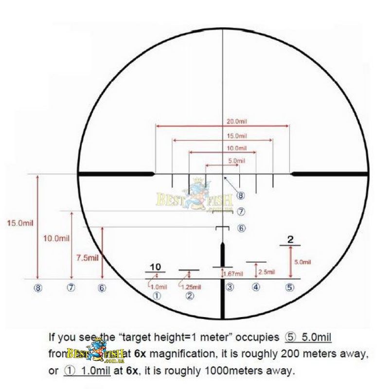 Специальная дальномерная сетка SKS IR значительно упрощает прицесс определения дистанции до цели. Все основные параметры этой прицельной марки верны при увеличении 6 крат. При размере цели 0,75 метра, 1 метр или 1,5 метра сетка точно определяет расстояние от 50 до 1000 метров. Исходя из указанных параметров сетки, можно определять расстояние до любой более мелкой или крупной цели методом интерполяции и вносить необходимые поправки.