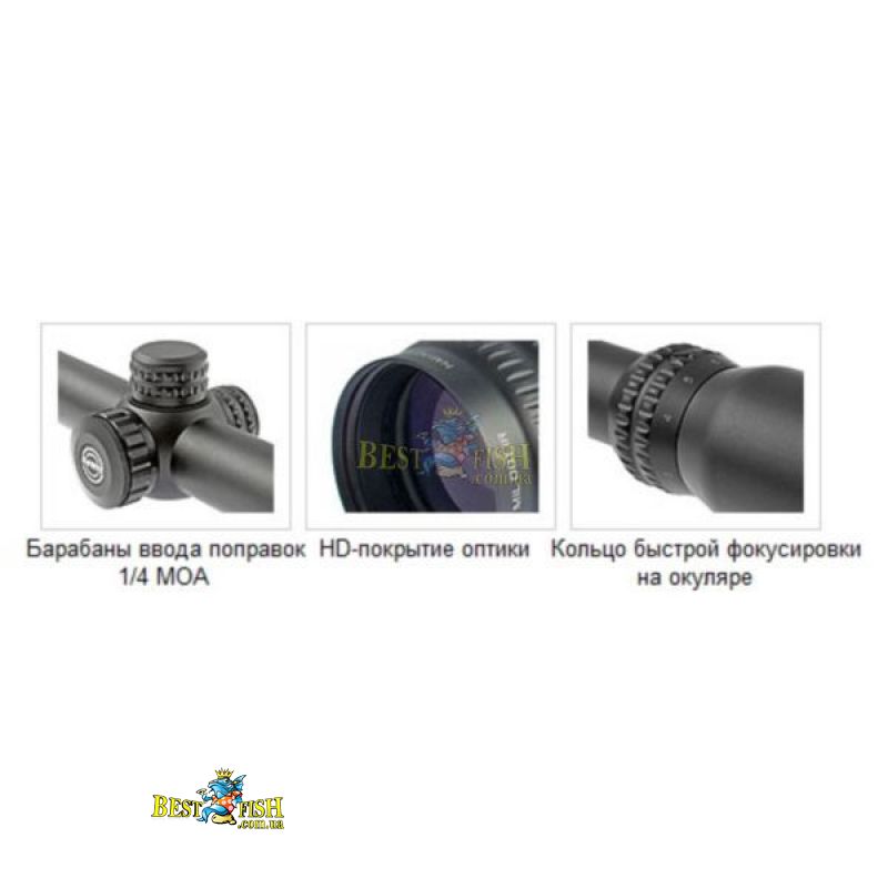- Подсветка прицельной сетки: красная/зеленая, регулируемая, по 5 уровней яркости для каждого цвета