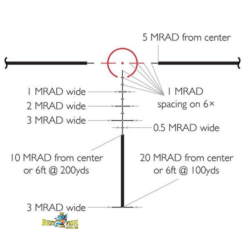 - Подсветка прицельной сетки: красная, 6 уровней яркости и 6 промежуточных положений выключения