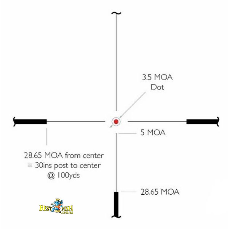 L4A IR Dot - это классическая охотничья сетка. Боковые толстые линии позволяют вести крупную движущуюся мишень и постоянно держать ее в поле прицельного выстрела, вместе с тем, тонкие внутренние линии дают возможность точной фиксации прицела на более мелких участках цели. Расстояние между центром сетки и началом толстой линии сетки соответствует 30 дюймам на 100 ярдах при увеличении 4х, что также дает возможность приблизительной оценки дистанции до цели. Центральная точка с красной подсветкой - для быстрого и точного выстрела в условиях пониженной видимости или отсутствия времени на длительное прицеливание. Персональную адаптацию сетки под конкретное оружие и тип снаряда позволит совершить бесплатный баллистический калькулятор X-ACT