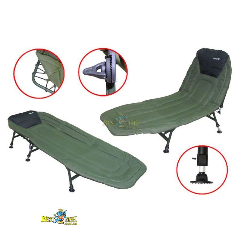 Ліжко оснащена шістьма регульованими ніжками з широкими шарнірними п'ятами, що дозволяє варіювати її висоту і істотно спрощує процес установки на нерівному березі водойми, землі або піску. Матрац виступає за межі рами, захищаючи від контакту з металом. При необхідності розкладачка швидко трансформується в зручне крісло. Завдяки новим вузлів регулювання змінити кут нахилу спинки можна за одну секунду. У складеному вигляді не займає багато місця в багажнику автомобіля і прекрасно підійде рибалкам великої статури, а також тим, хто любить просторе ліжко.