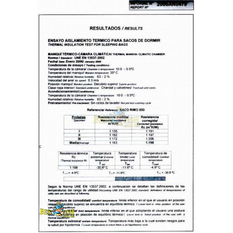Компания Sir Joseph была первой в Чехии, кто стал сертифицировать свои спальные мешки по стандарту EN 13357. Данный стандарт нормирует требования к спальным мешкам, и подтверждает соответствие указанных температурных режимов, размеров и веса на ярлыках. Согласно стандарта, предполагается, что человек одет в функциональное термобелье и использует коврик соответствующего температурного режима. Спальный мешок Sir Joseph Rimo II 850 тестирован на полное соответствие Европейскому стандарту EN 13357:2012.