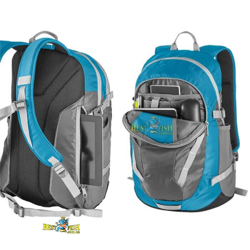 Современный мультифункциональный городской рюкзак Ferrino Bercy 30 Blue имеет ряд конструкционных решений, наиболее интересным из которых является большое мягкое отделение для планшета с боковым доступом на молнии. Отделение размещено таким образом, что планшет можно достать, не снимая рюкзака, но при этом замок молнии находится под рукой и его сложно будет расстегнуть со стороны. Основное же отделение максимально просторно. При необходимости туда можно поместить ноутбук и зафиксировать внутренними шлейками. Дополнительное отделение с органайзером имеет карабин для ключей. Два глубоких боковых кармана выполнены из эластичной сетки и окантованы эластичной стропой. Боковые стяжки на фастексах позволят зафиксировать в боковом кармане бутылку с водой или необходимые вещи. Специальная форма со скошенным дном позволила при достаточном литраже получить рюкзак плоского формата, благодаря чему с ним будет очень удобно передвигаться, не снимая в людных местах. Стоит отметить прочность и надежность рюкзака, благодаря структуре ткани Ripstop, и хорошую защищенность от воды благодаря PU-пропитке.