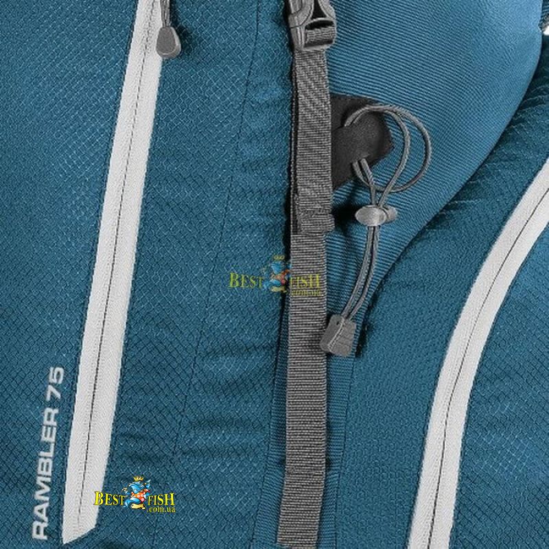 Trekking poles holders (2) - тримачі для трекінгових палиць розміщуються у верхній і нижній частині фасаду Трекінгові рюкзака і, як правило, являють собою комбінацію нижніх петель і верхніх стяжних еластичних шнурів з фіксатором. Рідше нижні петлі замінюються такими ж стяжними шнурами. Такі власники дозволяють надійно фіксувати трекінгові палки і не завантажувати ними внутрішній простір рюкзака. Даний рюкзак має дві пари кріплень для трекінгових палиць, поєднаних з кріпленнями для льодорубів.