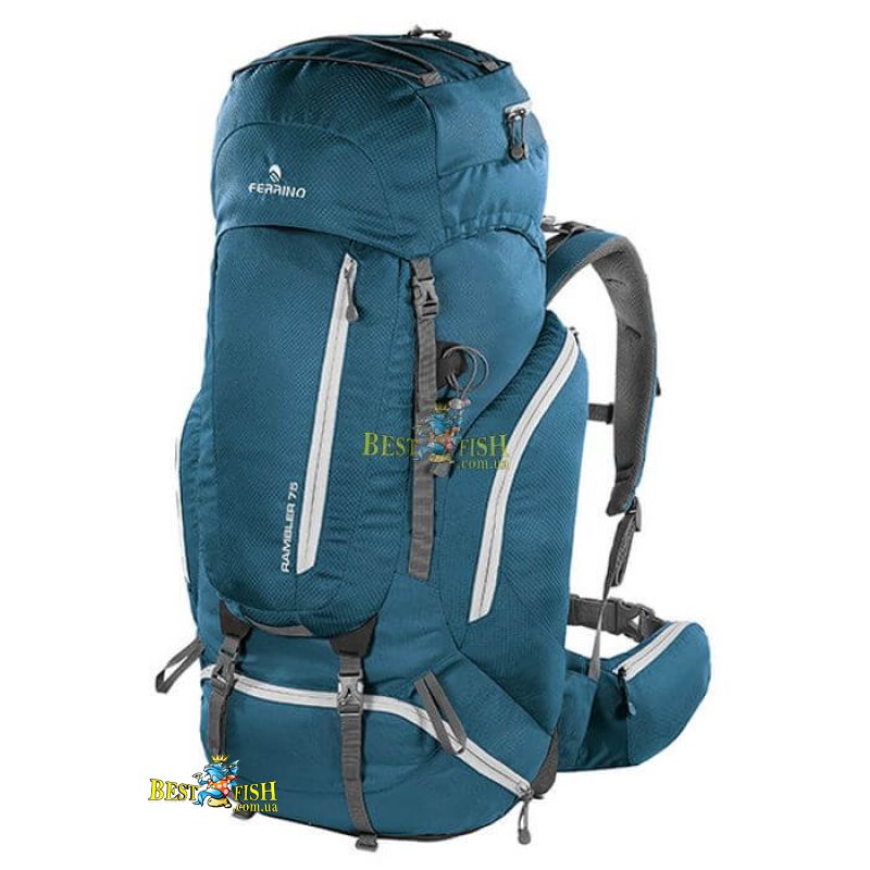 Рюкзак Ferrino Rambler 75 Blue. Якщо необхідний надійний, зручний і місткий трекінговий рюкзак для тривалого походу - неодмінно варто звернути увагу на Ferrino Rambler 75 Blue. Ця модель має оптимальний обсяг для тижневого походу в горах, зручну настроюється підвісну систему, рюкзак не перевантажений різними дизайнерськими і конструктивними рішеннями, виконаний з легких і міцних матеріалів, сумісний з питною системою і має захист від намокання у вигляді знімного чохла, захованого в потаємній кишені на дні рюкзака. Фронтальний вхід розстібається дуже широко і зручно, відкриваючи доступ до нижнього відсіку для розміщення об'ємного спального мішка, трекінгових взуття або іншого спорядження. Бічні кишені дуже просторі, фасадний кишеню ідвойной кишеню на клапані також місткі. Для дрібниць, які повинні знаходитись завжди під рукою, передбачено цілих дві кишені на поясі. Rambler один з не багатьох рюкзаків асортименті виробника, які оснащені верхнім еластичним шнурком на клапані для кріплення легкого одягу і ін. Фасадні кріплення для трекінгових палиць дозволяють зафіксувати також один або пару льодорубів. Додаткове спорядження також може бути пристебнуто до рюкзака нижніми компресійними ременями, або довгими стропами, що була надана.