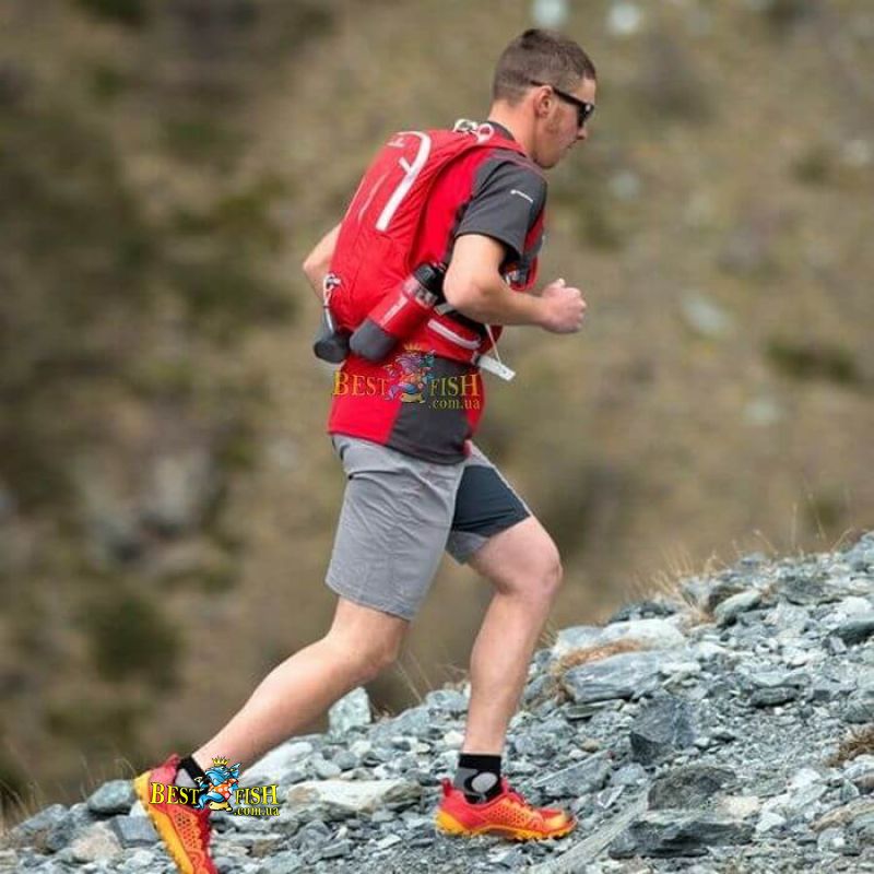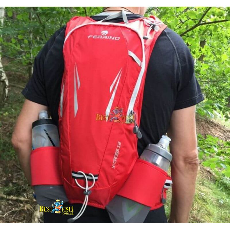 Рюкзак Ferrino X-Cross 12 Red - специализированный рюкзак для бега на длинные дистанции или трейлраннинга. Данная модель является одной из наиболее интересных среди подобных рюкзаков, благодаря возможности разместить сразу две питьевых системы, а также наличию двух держателей для фляг диаметром 70 мм, размещенных на поясном ремне. Таким образом, с наличием воды в дороге проблем не будет. Гидросистемы занимают не весь полезный объем рюкзака, поэтому с собой на пробежку можно взять и ветровку и легкую сменную одежду. Необходимые мелочи можно разместить в пяти карманах, два из которых находятся на поясе, два на плечевых шлейках и один карман с карабином для ключей находится внутри. На фасаде имеются эластичные стяжные шнуры для треккинговых палок. С целью обеспечения максимальной безопасности бегуна, рюкзак оснащен свистком и отражающими элементами на фасаде. Спинка, широкие шлейки и широкий пояс рюкзака - отлично вентилируемые с мягкой подкладкой. Ткань очень легкая и прочная, не впитывает воду и дополнительно обработана водоотталкивающим составом.