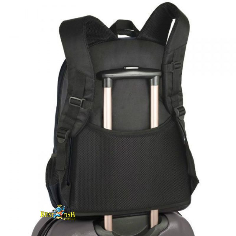 Для удобства транспортировки рюкзака, конструкцией предусмотрена возможность переноски самого рюкзака непосредственно на выдвижной телескопической ручке чемодана или сумки. Для этого, в спинке рюкзака расположен специальный проем, продев через который ручку чемодана или сумки, рюкзак надежно будет зафиксирован.