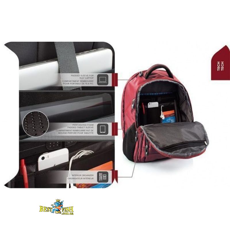 Отделения для транспортировки ноутбука диагональю 15.6, планшета 10 и смартфона выполнены из легкого, перфорированного неопрена. Неопрен дополнительно обшит флисовой подкладкой. Это позволяет защитить ценные вещи от нежелательных механических повреждений и царапин. Предусмотрен отдельный карман с флисовой основой для транспортировки очков. Отделение с функциональным органайзером имеет карабин с фиксатором для ключей, а так же множество дополнительных отделений для различных аксессуаров.