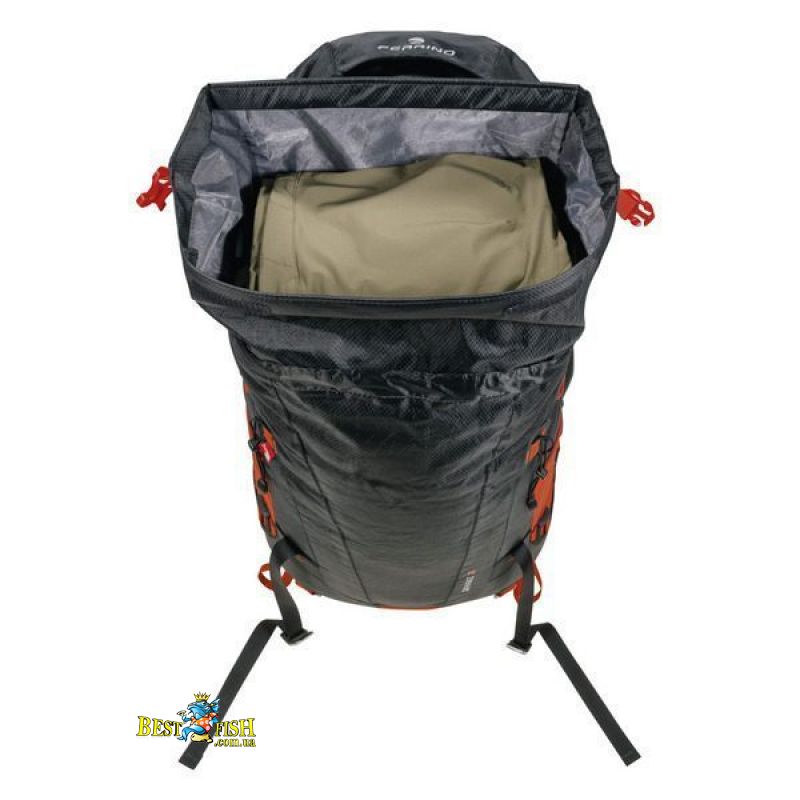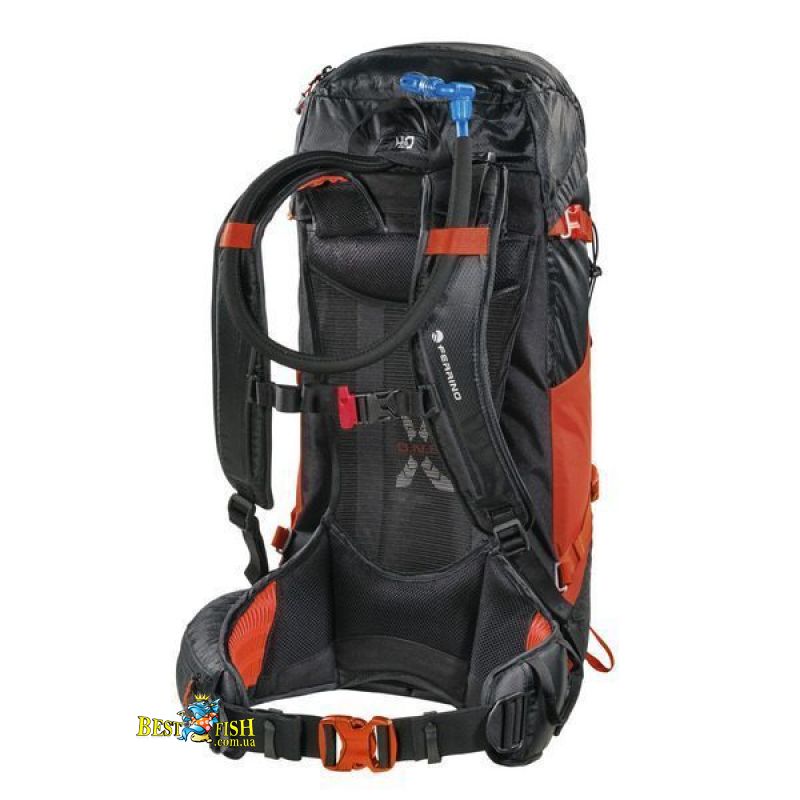 Рівень водозащити 10 000 мм водяного стовпа для текстильного рюкзака став реальний завдяки запатентованої технології OutDry 3D, Саме ця мембранна технологія застосована в рюкзаку Ferrino Dry-Hike 32 OutDry Black. Карман в клапані має блискавку з гідробар'єром, а горловина основного відділення згортається, фіксується фастексами і герметизуються, таким чином рюкзак є на 100% водонепроникним. Ferrino Dry-Hike 32 OutDry Black більшою мірою призначений для лижних походів і активних занять альпінізмом, проте відмінно підійде для хайкерів, що шукають водозахищений рюкзак з великим запасом надійності. Основний упор при розробці рюкзака був зроблений на максимальну захищеність і довговічність. На додаток до 100% водонепроникності, надійність рюкзака досягнута за рахунок використання міцних матеріалів (в шести точках зміцнений накладками з матеріалу Hypalon®), і кращої фурнітури (YKK, Duraflex, WooJin). Підвісна система DNS забезпечує кращу вентиляцію спинки. Основне відділення рюкзака має внутрішній витяжної регулювальний клапан і позбавлене кишень. Таким чином, маючи номінальний обсяг 32 літри, дана модель відрізняється великою місткістю завдяки просторому внутрішньому відділенню і широкої горловині входу. Розробники рюкзака подбали, щоб Ви не залишились без води в поході і передбачили як бічні об'ємні кишені для фляг, так і окремий глибоку кишеню на застібці, який може використовуватися і для інших цілей. Верхній клапан обладнаний кишенею на блискавці з карабіном для ключів. Кріплення необхідного додаткового обладнання і спорядження в найбільш зручному положенні не складе проблем: для цього передбачено достатню кількість компресійних стяжок, петель і фіксаторів. Центральні застібки з алюмінієвим гаком дуже практичні з точки зору швидкого розстібання рюкзака.