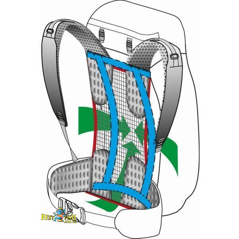 - Спина: завдяки системі Dry Net System Back є повністю вентильованого. Додаткове повітряний простір між спиною і рюкзаком сприяє ефективній вентиляції. Валики з м'якою пенополиуретановой підкладкою обшиті дихаючої сітчастої тканиною.