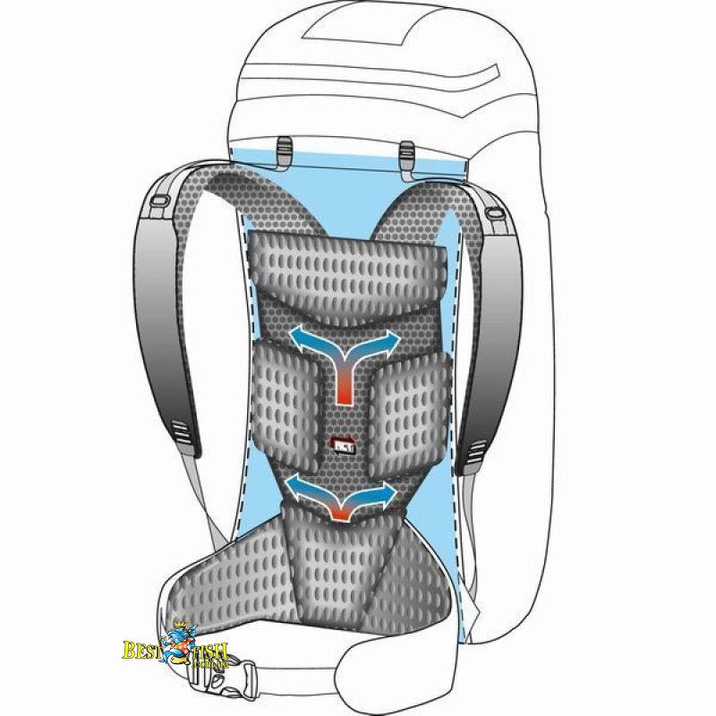 - Спина: благодаря системе Air Convector Tech Back является мягкой, но хорошо вентилируемой. Вентиляционные каналы позволяют циркулировать воздуху между спиной и рюкзаком. Валики с мягкой пенополиуретановой подкладкой обшиты дышащей сетчатой тканью.