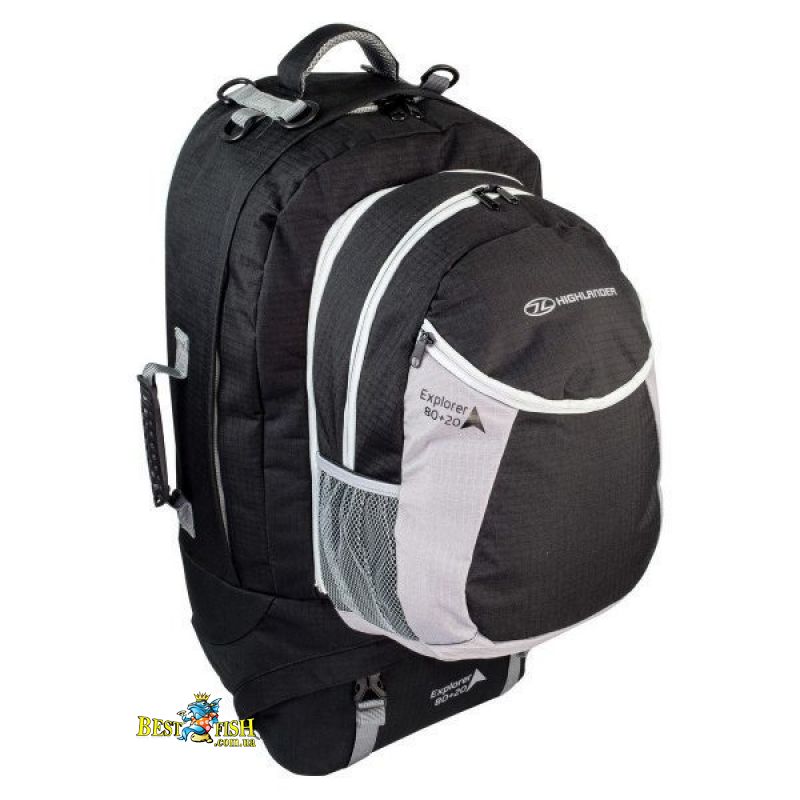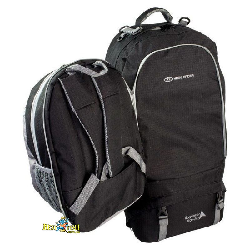 Рюкзак Explorer Ruckcase 80 + 20 Black - бестселер компанії Highlander. Це мультифункціональний рюкзак-сумка, який найкращим чином підходить для сімейних поїздок, подорожей, і нескладних походів. Explorer Ruckcase 80 + 20 Black може бути використаний як великий рюкзак, як два окремих рюкзака і як малий рюкзак з дорожньою сумкою. Тепер модель вдосконалена і пошита з міцної на розрив тканини з переплетенням Ripstop. Великий рюкзак має повноцінну підвісну систему, регульовану по висоті, м'яку вентильований спинку, шлейки анатомічної форми, поясний ремінь і нагрудну стяжку, що сприяє комфортній перенесенні великої кількості багажу.