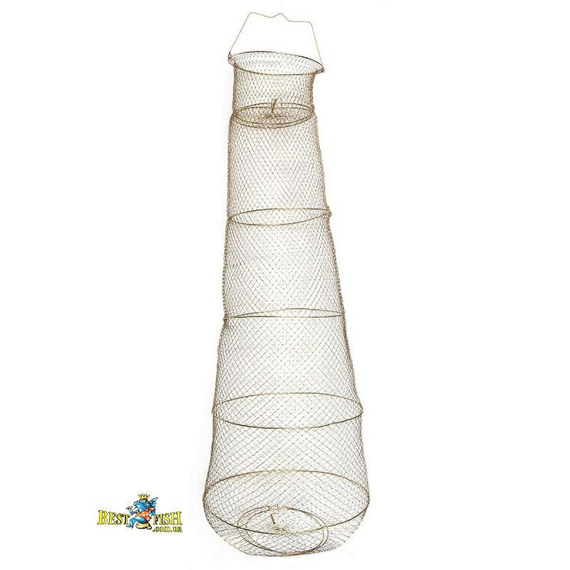 Модель має діаметр 40 см, значну глибину 150 см і конструкцію з шести кілець, що дозволяє розмістити рибу більш вільно та комфортно. Завдяки подовженому формату садок краще працює у водоймі, де важливо забезпечити улову достатній простір. Виробник також передбачив захисну кришку на пружині та нижній випускний отвір з кришкою, що робить доступ до риби зручнішим. Металева сітка є міцною, довговічною та легко очищується після використання, тому модель підходить для регулярних виїздів у літній сезон.
