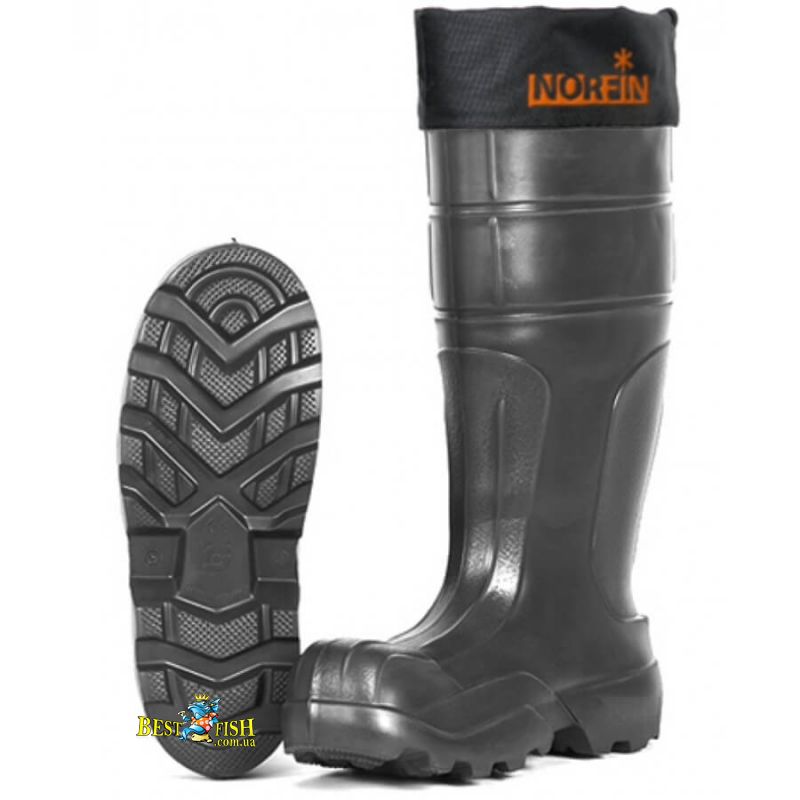 Norfin Glacier - це чоловічі зимові чоботи з гумовою підошвою і високим протектором, виконані з високоякісного матеріалу EVA. За рахунок особливостей матеріалу EVA, що представляє собою спінену гуму, в якій розчинена велика кількість мікропухирців повітря, наявності повітряних камер між ним і гумою, а також спеціальним виймають вкладиша з поліестеру і перфорованої фольги, чоботи надійно захищають ноги від замерзання при температурі до -50 ° С.