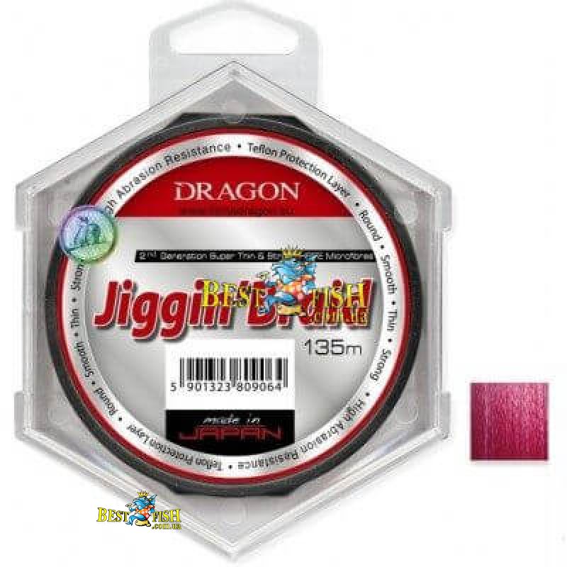 Даний шнур Dragon з матеріалу корпорації TORAY (Японія), називається Jiggin Braid і призначена в основному для лову таких риб як щука і окунь різними методами лову спінінга. Останні кілька сезонів на практиці підтвердили попереднє дослідження щодо правомірності використання червоного кольору для забарвлення волосіні і шнура. І монофільні волосіні, і плетені шнури пофарбовані в різні відтінки червоного так що абсолютно очевидно на воді, опинилися під водою не видимі для риби через зникнення червоного спектра вже за кілька футів під поверхнею води. Jiggin Braid, прекрасно підходить для джигових методів лову, а тефлонове покриття забезпечує високу зносостійкість, високий захист від механічних пошкоджень і зовнішніх несприятливих факторів, що значно подовжує термін служби шнура. Шнур Dragon Jiggin Braid випускається в червоному кольорі і розмотування по 135 метрів.