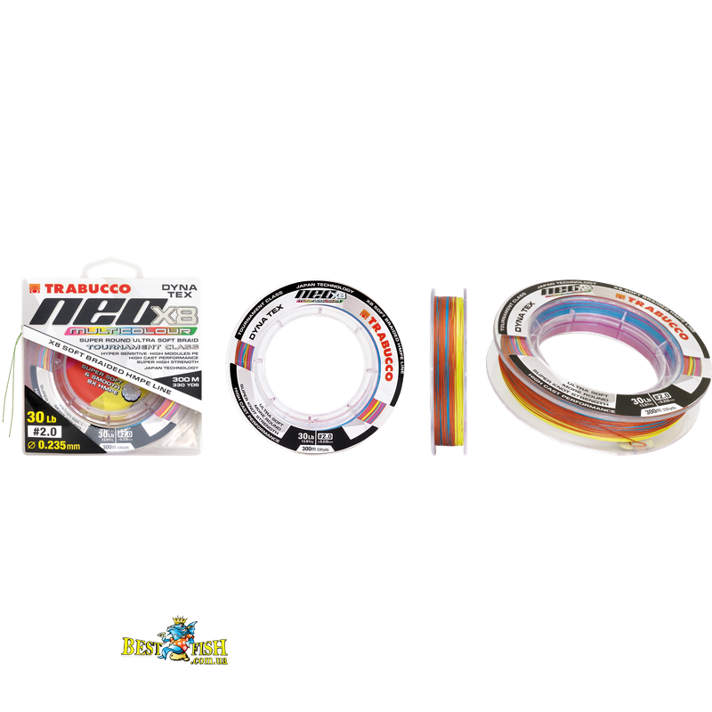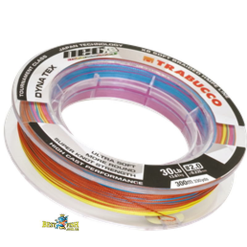 Trabucco Dyna-Tex Neo X8 Multi - восьмижильний плетений шнур із багатокольоровим маркуванням, створений для ситуацій, де потрібні точний контроль дистанції та глибини, мала розтяжність і висока міцність. Завдяки зміні кольору через певні інтервали рибалка може краще відстежувати робочу дистанцію та повторювати потрібну подачу. Плетіння з восьми жил забезпечує більш круглий переріз, м'який хід і комфортний схід зі шпулі, що позитивно позначається на закиданні. Шнур розрахований на інтенсивне використання, має добру чутливість і дозволяє ефективніше контролювати оснащення. Варіант із довжиною 300 м, діаметром 0.405 мм та навантаженням 34.02 кг підійде як основний шнур для рибалки, який хоче отримати максимальну інформативність.