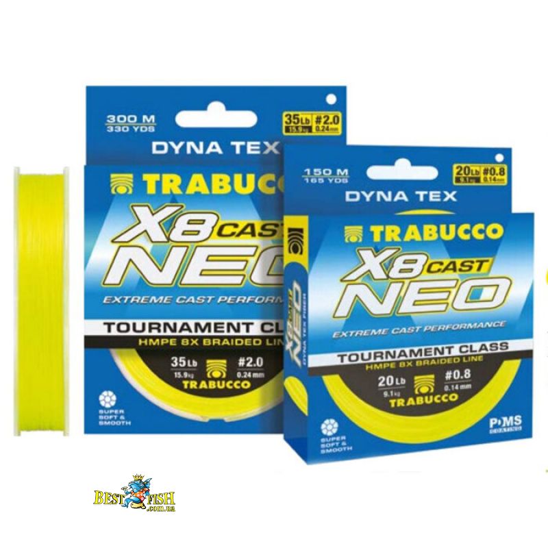 Trabucco Dyna-Tex X8 Neo Cast - восьмижильний плетений шнур, орієнтований на дальній і точний закид у спінінговій риболовлі. Плетіння з восьми жил забезпечує більш рівний і круглий профіль, завдяки чому шнур тихіше проходить через кільця, м'якше працює на шпулі та сприяє комфортній подачі приманки. Серія відома високою м'якістю, чутливістю та стійкістю до стирання, а яскравий жовтий колір полегшує візуальний контроль проводки та положення шнура. Розмотування 150 м, діаметр 0.205 мм і навантаження 11.34 кг роблять конкретний варіант придатним як основний шнур для спінінгового комплекту, де важливі інформативність і контроль. Це практичний вибір для рибалки, який шукає м'яку та чутливу восьмижильну плетінку.