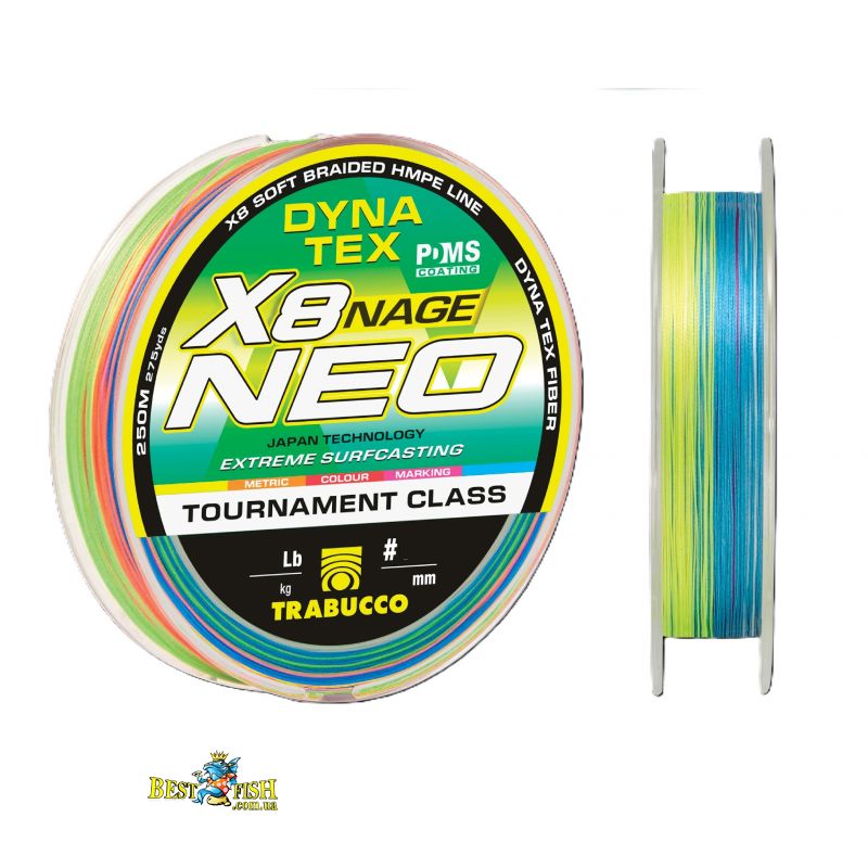 Trabucco Dyna-Tex X8 Neo Nage Surf - високотехнологічний восьмижильний шнур, створений насамперед для змагального серфкастингу та морського берегового лову. Його конструкція забезпечує круглий переріз, високу м'якість і хорошу дальність закидання, а багатокольорове маркування через інтервали допомагає точно контролювати дистанцію. Для серії також характерні висока стійкість до стирання, добра лінійна міцність і відсутність механічної пам'яті, що особливо важливо при постійних силових закиданнях. Варіант із довжиною 250 м, діаметром 0.104 мм та навантаженням 4.54 кг доречно використовувати як основний шнур для серфкастингу, коли на першому місці стоять контроль, точність і ресурс.