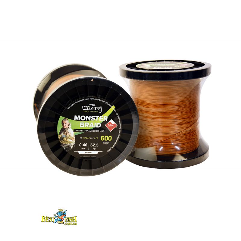 Шнур з голкою Wizard 12X Monster Braid Teflon 600 м 0.58 мм 70.2 кг - це силовий плетений шнур для відповідальної риболовлі, де важливі максимальна міцність, рівне кругле плетіння та стійкість до стирання. Серія Monster Braid Teflon має 12-жильну конструкцію, завдяки якій шнур працює плавно, рівномірно сходить зі шпулі та краще витримує серйозні навантаження. Додаткове тефлонове покриття робить поверхню гладкішою, зменшує тертя, покращує ковзання через кільця та допомагає знизити водопоглинання під час ловлі.