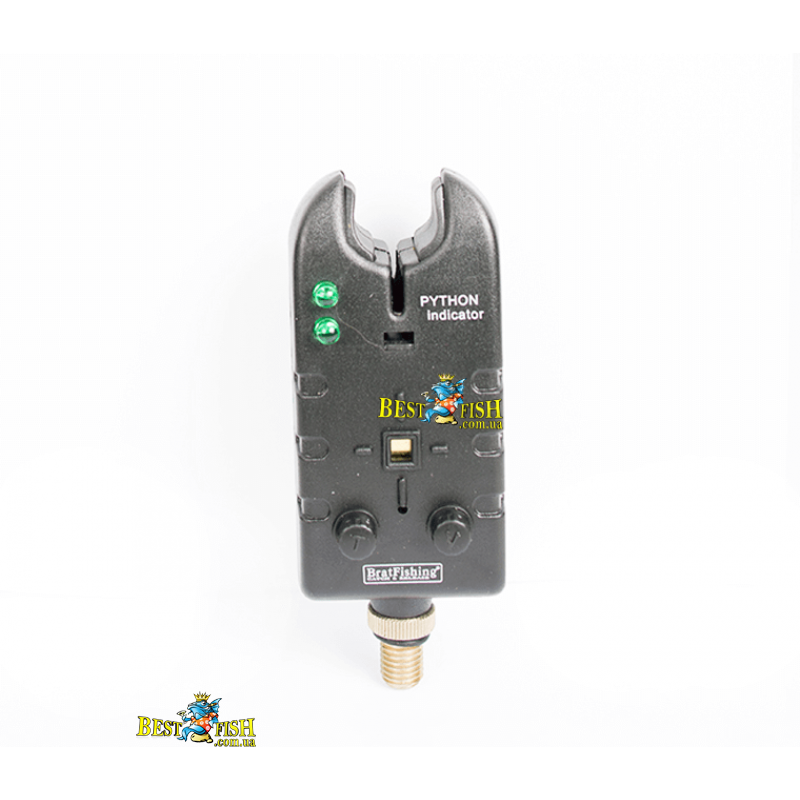 Фірма BratFishing представляє лінійку нових сигналізаторів клювання. Самий універсальний сигналізатор клювання BratFishing Python. Має регулятор гучності і тональності. 2 світлодіоди сигналізують про різні поклевках, в берег і від берега. Випускається в чотирьох кольорах світлодіодів (червоний, зелений, жовтий, синій)