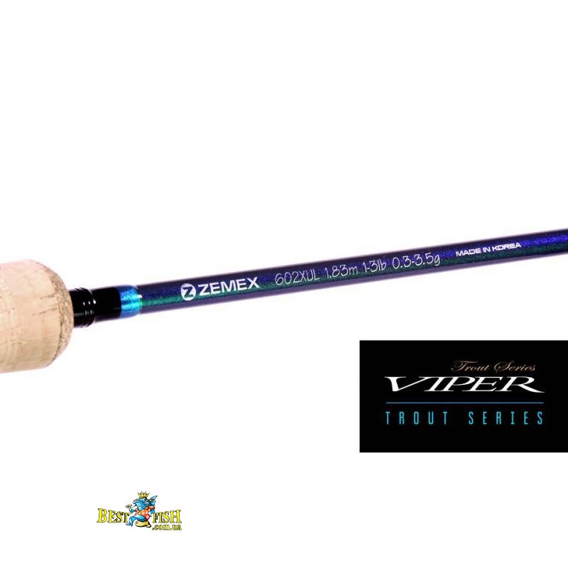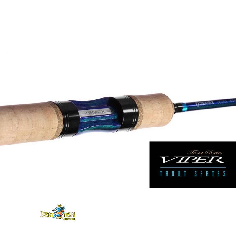 Абсолютно нова лінійка вудилищ в модельному ряду Zemex. Серія розроблена спеціально для лову форелі, а також добре підходить для лову головня і інших «білих» хижаків на легкі колебалки, вертушки і воблери. Перше, на що слід звернути увагу, це більш швидкий лад нових Viper Trout, в порівнянні з класичними форелеве вудлищами. Таким чином, можна успішно ловити форель як в Area-водоймах, так і в швидких гірських річках. В'язкість бланка Viper Trout відмінно утримує рибу на спортивних безбородих гачках, а його чутливість не дозволить пропустити ніжну форелеву клювання навіть на силікон. Одним з важливих якостей серії Viper Trout є можливість здійснювати більш швидкісний виведення форелі, що дуже актуально на змаганнях. Після підсічки бланк зразу включається в роботу і відпрацьовує кожен з ривків риби, будь то форель, головень, або будь-яка інша риба. До того ж не варто переживати, якщо на гачку раптом виявиться 3-4-кілограмова особина, характеристики Viper Trout дозволять вам керувати рибою так, як ви цього захочете.