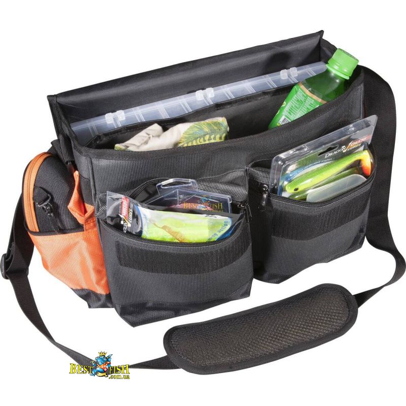 Зручна наплічна сумка. Надійна застібка на широку липучку дозволяє отримати швидкий доступ до вмісту сумки. У сумці поміститься кілька коробок з приманками середньої величини, а також бутерброди і напої. Сумка має чотири кишені, що закриваються застібкою-блискавкою. Ця сумка призначена для любителів берегової риболовлі, для яких на першому місці практичність.