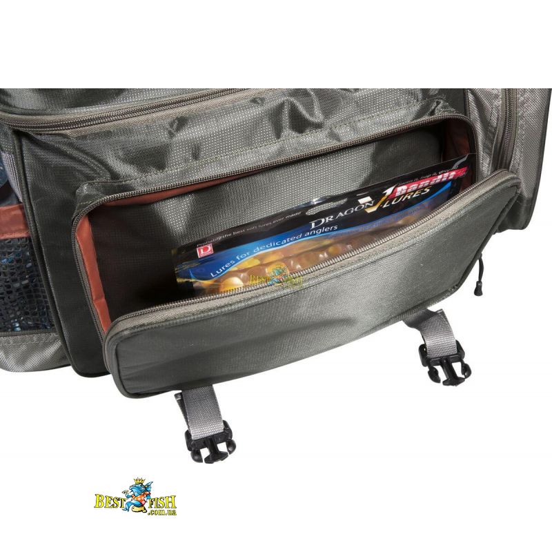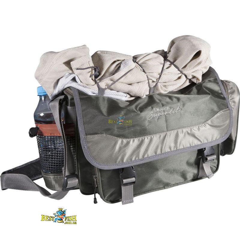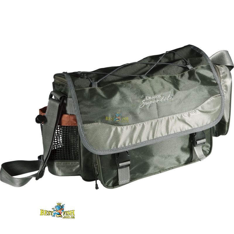Сумка серії Dragon SuperLite є відмінним вибором для рибалки який бере з собою тільки необхідна мінімальна кількість снастей при цьому намагаючись максимально полегшити свою ношу. Сумка має основне відділення на блискавці в яке вміщуються 2 великі коробки з приманками, 2 бічних кишені і великий передній кишеню для аксесуарів. На кришці є гумка для фіксації одягу. Сумка виготовлена з дуже міцного і легкого нейлону стійкого до порізів і стирання.