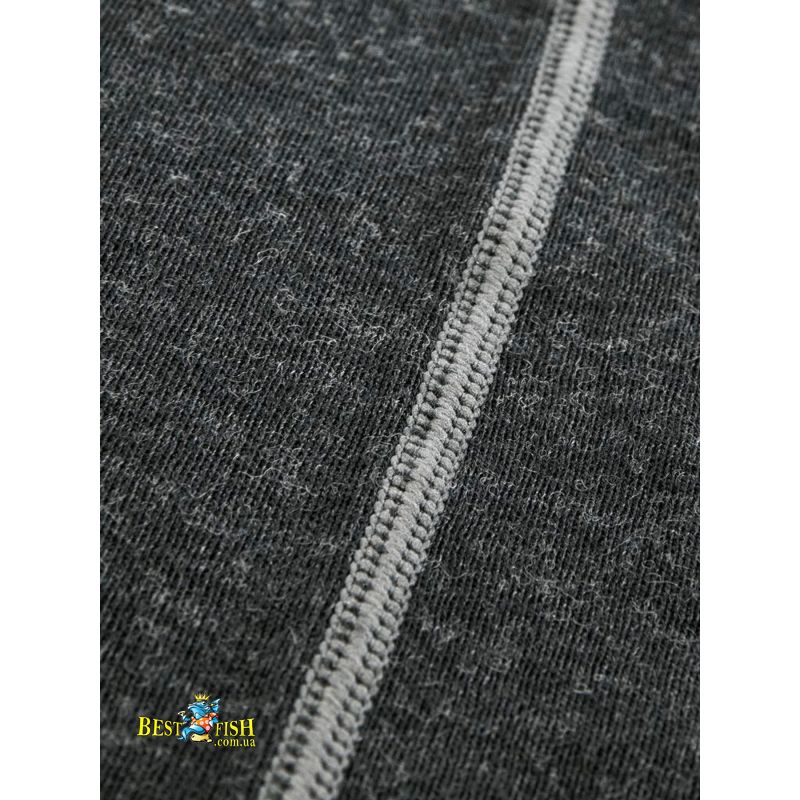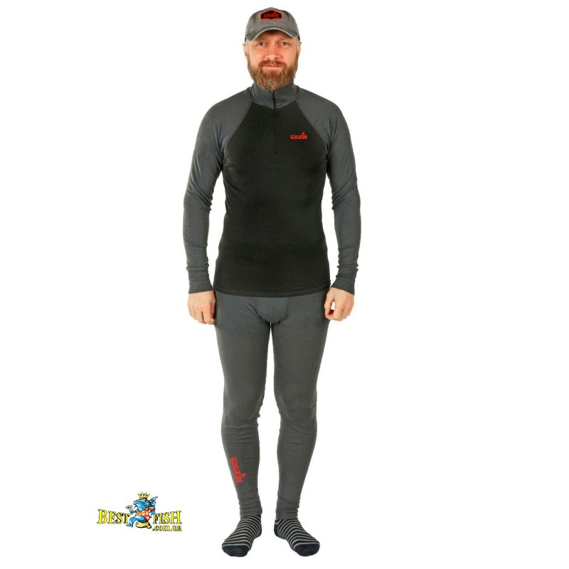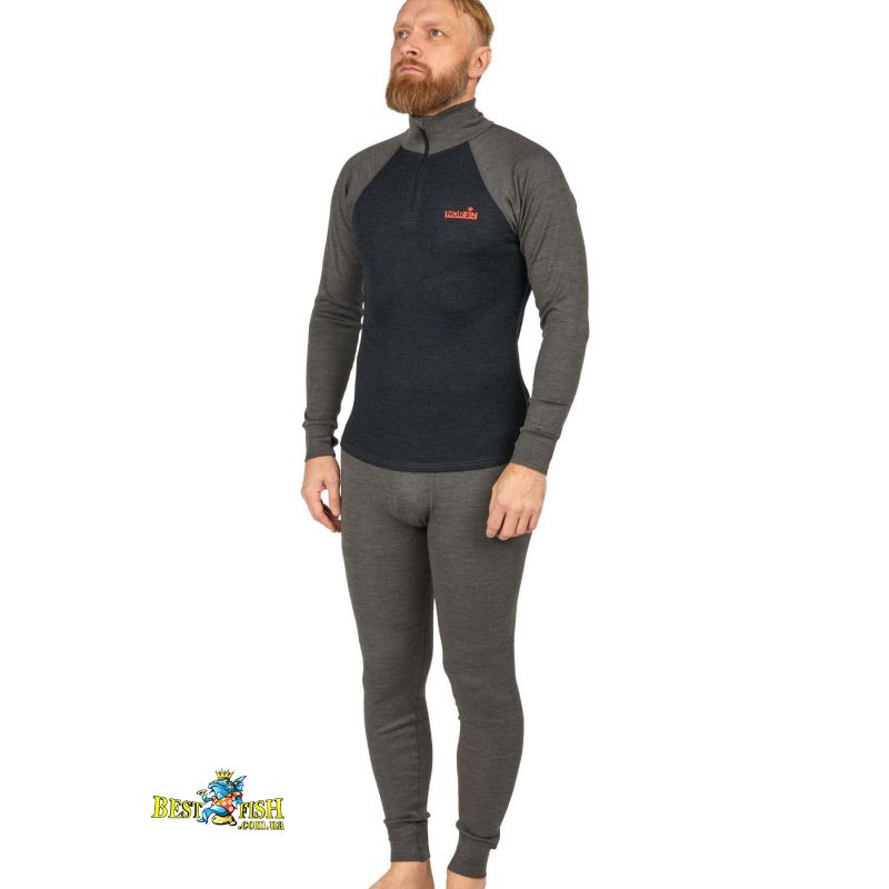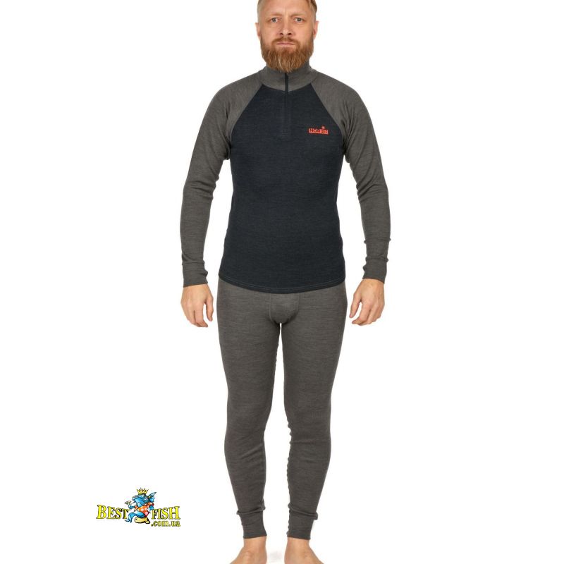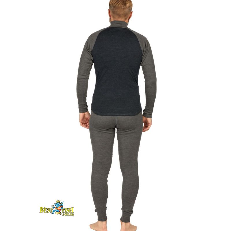 Чоловічий термокомплект першого шару з вовною мериноса для холодної та прохолодної погоди. Матеріал забезпечує природну терморегуляцію, ефективно відводить вологу, швидко висихає та допомагає зменшити появу неприємного запаху. Комплект має плоскі шви, високий комір із короткою блискавкою, рукави реглан і еластичний пояс штанів для комфортної посадки.