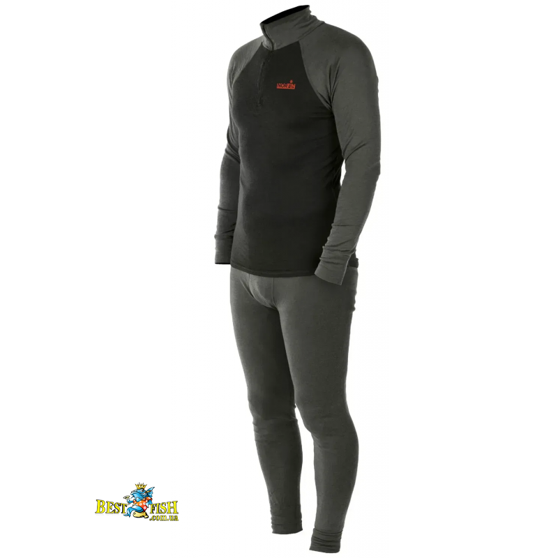 Чоловічий термокомплект першого шару з вовною мериноса для холодної та прохолодної погоди. Матеріал забезпечує природну терморегуляцію, ефективно відводить вологу, швидко висихає та допомагає зменшити появу неприємного запаху. Комплект має плоскі шви, високий комір із короткою блискавкою, рукави реглан і еластичний пояс штанів для комфортної посадки.
