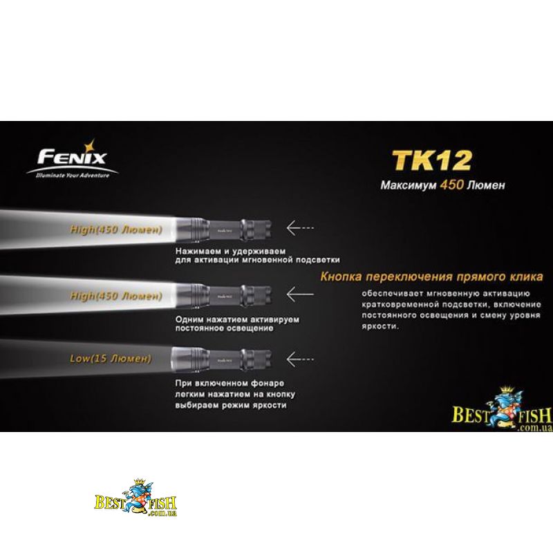 Имея «на борту» улучшенный американский светодиод Cree XP-G2 (R5), ТК12 демонстрирует потрясающую производительность и мощность — максимальный предел его яркости составляет 450 люмен при дальнобойности в 230 метров. Всего в модели реализовано три оптимальных варианта освещения (450 люмен, 130 люмен и 15 люмен), управление которыми производится тактовой кнопкой в хвосте фонаря. Модернизация светодиода также повлекла за собой значительное сужение пучка света и повышение его показателей в плане сконцентрированности и дальнобойности .