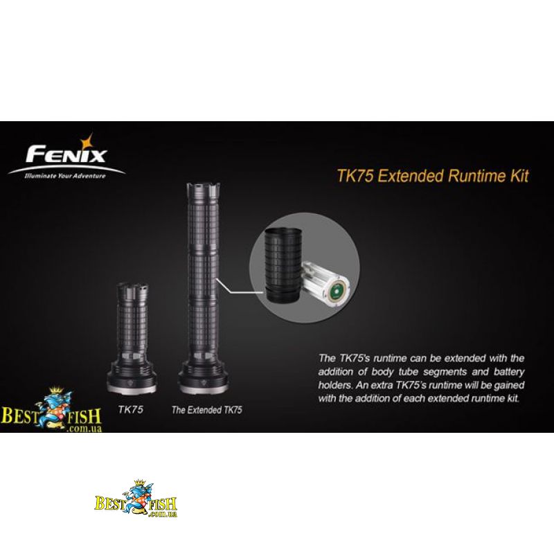 Время работы фонаря Fenix ТК75 может быть увеличено с помощью добавления секций корпуса, которые поставляются в комплекте с батарейной кассетой. Одновременно можно добавлять несколько секций, при этом время работы фонаря будет увеличиваться с каждой секцией. Кассета содержит 4 литий-ионных аккумулятора 18650. Конструкция фонаря и дополнительных секций позволяют наращивать корпус практически до бесконечности. Однако производитель не рекомендует использовать более 3-х секций корпуса с одним фонарем.