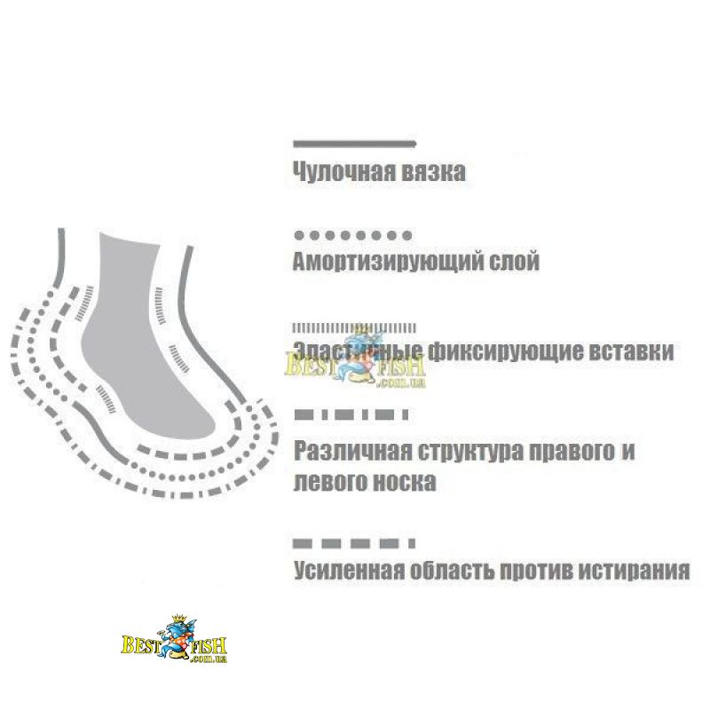 Antitorsion stretch band - эластичные вставки на ступне и/ или щиколотке, которые обеспечивают максимальное прилегание носка к ноге и препятствуют его вращению и сползанию в обуви. Такие носки лучше облегают ногу и обеспечивают стабильность во время ходьбы и особенно во время занятий спортом.