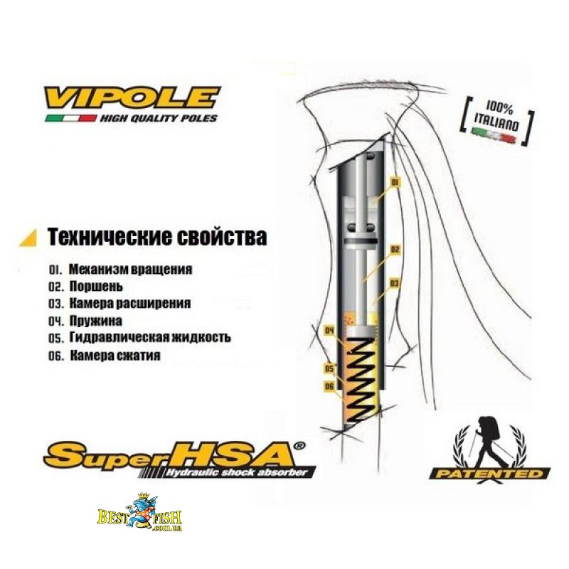 SHSA (Super Hydraulic Shock Absorber) - комплексная гидравлико-механическая система гашения вибрации. Компания Vipole имеет патент на эту технологию, и небезосновательно заявляет о том, что эта система антишока телескопических палок самая эффективная на сегодняшний день. SHSA в значительной степени снижает влияние непрерывных вибраций при ходьбе, предотвращает усталость и воспаление связок запястного, локтевого и плечевого суставов. Гидравлическая жидкость, не зависимо от нагрузки, равномерно перетекает из одной камеры поршня в другую и обеспечивает плавную работу витой пружины, при этом движение рук остается максимально естественным без резкого проседания вниз и последующего отталкивания. При этом, во время прогулки или треккинга по ровной местности, гидравлический антишок имеет минимальный диапазон движения, экономя энергию рук. Благодаря очень плавной работе и расположению системы в центре тяжести, оборудованные SHSA треккинговые палки имеют надёжное сцепление на твердых породах (наконечник не отпружинивает от поверхности) и улучшенную балансировку (уменьшается раскачивание палки в движении), чем достигается высокий уровень комфорта при ходьбе.