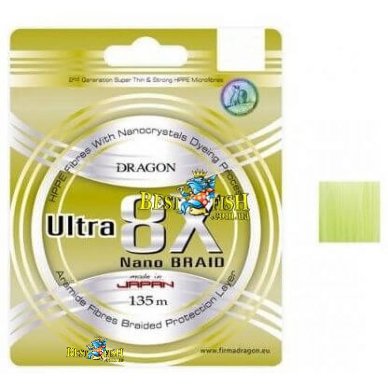 Dragon Ultra 8x Nano майже на 100% нерастяжім, має дуже щільне плетіння, спеціально розроблений спосіб сплетіння волокон абсолютно не поглинають воду. Дуже добре укладається на шпулю котушки, як на безінерційну так і на мультиплікатори. Не має тенденції врізки між витками, навіть при дуже великому навантаженні, якщо до цього додати, що шнур повністю позбавлений пам'яті форми, гладкий і шовковистий, дозволяє робити дуже далекі і точні кидки. З упевненістю можна сказати, що ми маємо шнур який повністю задовольняє всім вимогам лову спінінга. Dragon Ultra 8x Nano має дуже високу міцність на вузлах, спеціальна обробка поверхні запобігає сплутування нитки навіть при риболовлі в складних умовах, наприклад, при сильному поривчастим вітром. Для фарбування волокон використовується фарба з наночастинками, такий барвник набагато стійкіше до поверхневого стирання.